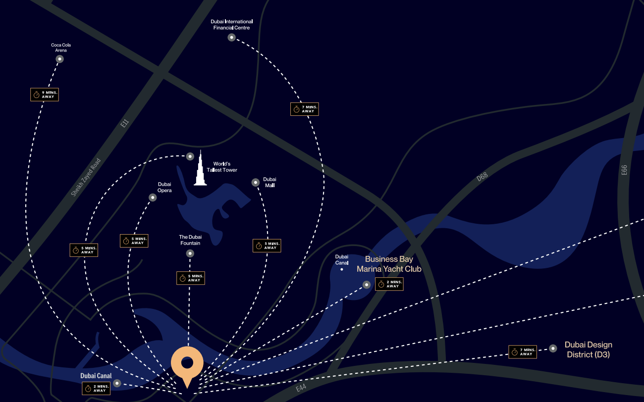 Distinguished by cutting-edge technological solutions and sophisticated interiors, the project caters to the expectations of even the most discerning residents. Expansive floor-to-ceiling windows provide breathtaking panoramic views of the city skyline and the Dubai Canal, adding to the allure of this exceptional development.